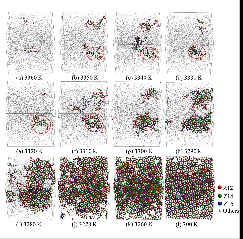 周丽丽教授课题组的分子动力学模拟研究发现,液态金属钨在快速凝固情况下,形成了由Z12,Z14,Z16原子以10:16:4的比例组成的复杂拓扑密堆晶相。拓扑密堆相复杂的晶胞结构的直接表征识别,不管是实验研究还是数值模拟都面临困难,其晶化机理还处于未知状态。而且,由于Z12, Z14,Z16团簇是过冷液态及非晶态中的常见结构,拓扑密堆晶体的晶化机理必然不同于普通晶体。该研究工作清晰地揭示了拓扑密堆相晶核的形成和演化机理,具体可分为三个阶段:晶核的孕育,晶核的急剧长大和兼并,晶核的粗化和优化过程。