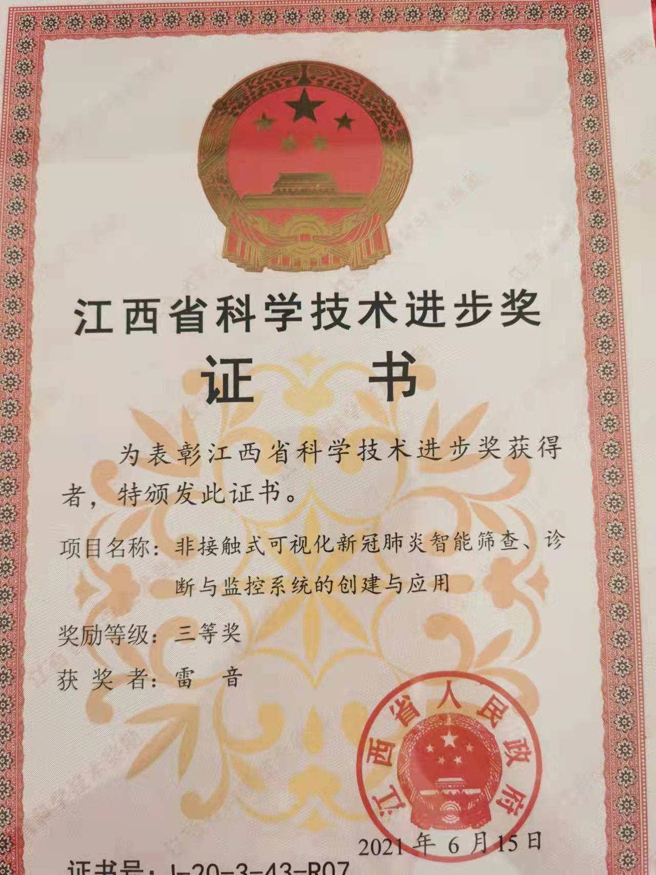 2.与憶源科技合作共同研发的“非接触式可视化新冠肺炎智能筛查、诊断与监控系统的创建与应用”项目获得江西省科学技术奖;