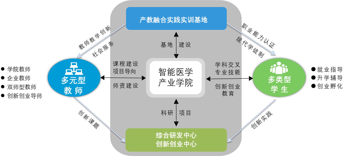 学院以四个坚持为抓手:坚持育人为本,提高人才培养能力为核心;坚持产业为要,面向产业急需,紧密对接产业链;坚持产教融合,产、学、研、转、创、用结合;坚持政、校、企多主体共建共管共享。实施“产学研创”四位一体创新办学模式,与产业头部企业合作共建,着力培养智能医学为特色的新医科应用型人才。